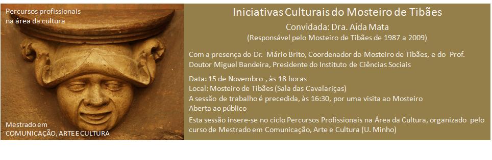 Iniciativas Culturais do Mosteiro de Tibães é o tema da próxima sessão de trabalho, que terá lugar no dia 15 de Novembro, às 18 horas, na Sala das Cavalariças do Mosteiro de Tibães. A Dra. Aida Mata, Responsável pelo Mosteiro de Tibães entre 1987 e 2009, é a pessoa convidada. A sessão conta também com a participação do Dr. Mário Brito, Coordenador do Mosteiro de Tibães, e do Prof. Doutor Miguel Bandeira, Presidente do Instituto de Ciências Sociais.