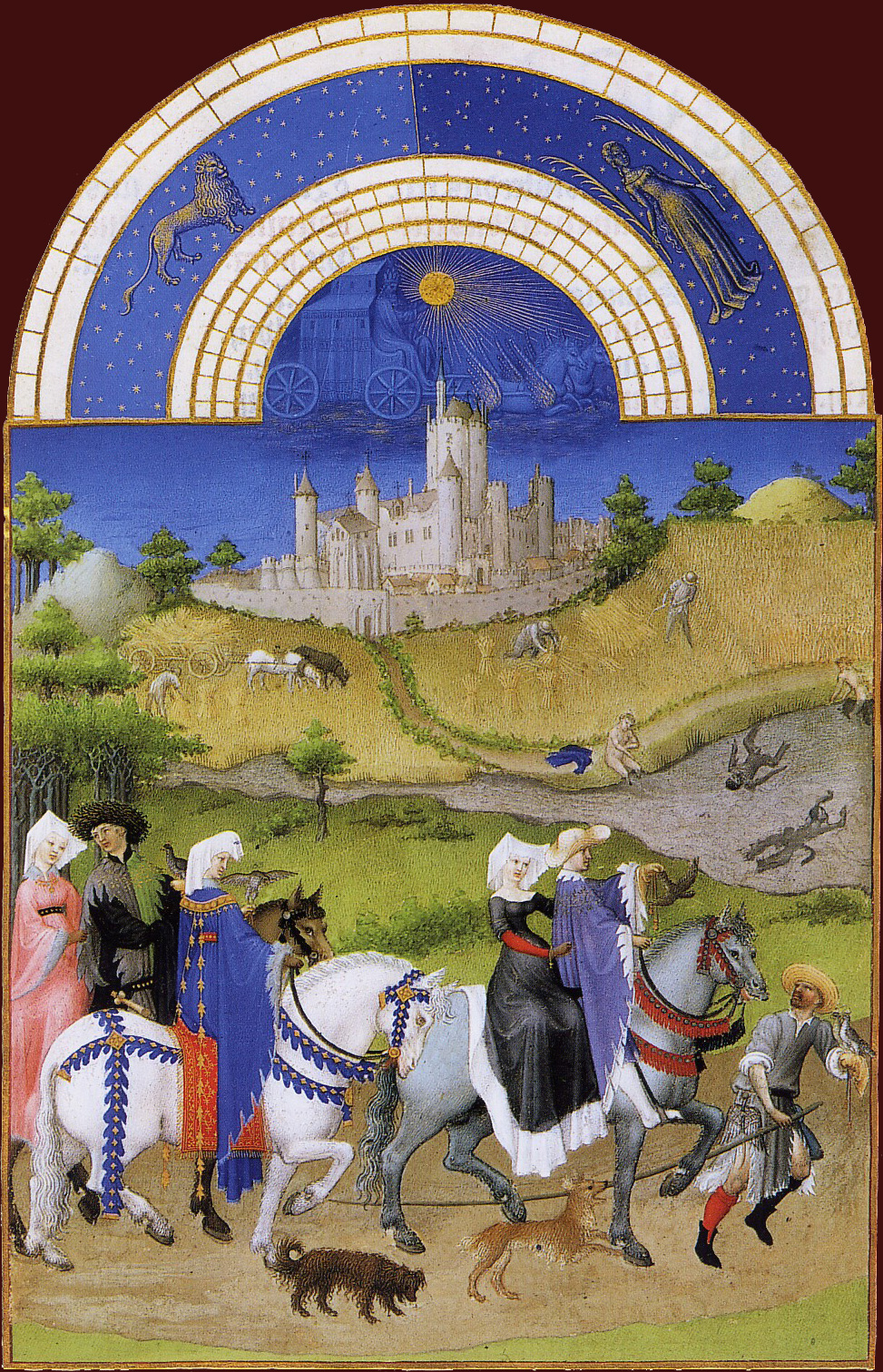 08. Les Très Riches Heures du duc de Berry. Agosto. Nobres com falcões.