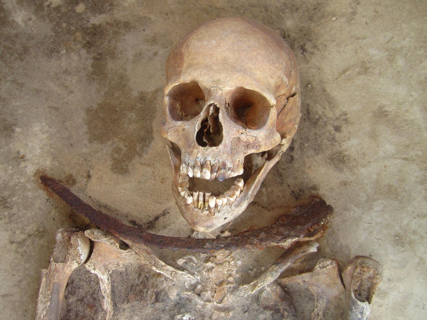 09. Esqueleto de mulher enterrada com foice na garganta. Polónia, secs XVII e XVIII